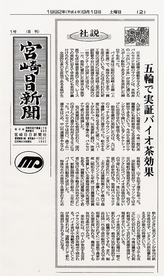 バルセロナ五輪男女マラソンでは、銀メダルを獲得した、森下広一選手(旭化成)と有森裕子選手(リクルート)、4位の中山竹道選手(ダイエー)と山下佐知子選手(京セラ)も給水時のスペシャルドリンクとしてバイオ茶を愛飲。選手の皆さんの活躍によって、バイオ茶は「魔法の水」としてマスコミに取り上げられました。1991年9月の世界陸上東京大会男子マラソン直前のスポーツ紙では、「灼熱の東京でレースの鍵を握るのは水分補給。谷口選手は『魔法の水を用意している』」として、上水園を紹介。同年12月の福岡国際マラソンでは優勝選手を含め、上位3人がバイオ茶を愛飲し、スポーツ紙で「勝負を決めた、魔法のお茶」と紹介されました。